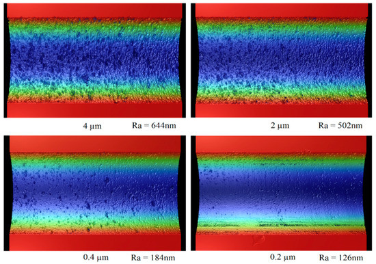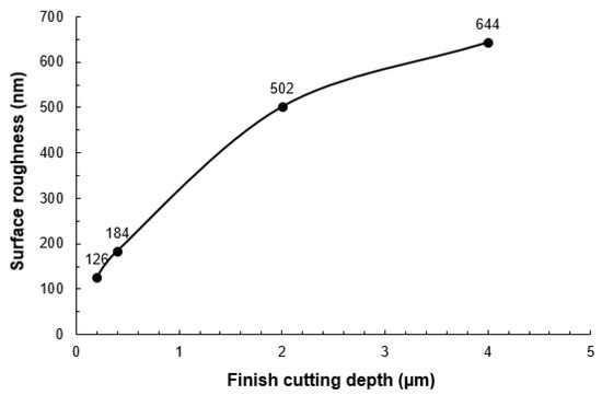 Figure 13 shows the groove surface profiles measured by Zygo (Newview 8000, Zygo Corporation, Middlefield, CT, USA) after finish cutting with different depths of cuts. For all of the grooves, the total cutting depth was the same. For example, if the total finish cutting depth was 4 μm, it would need one pass for a depth of cut of 4 μm and twenty passes for a depth of cut of 0.2 μm.