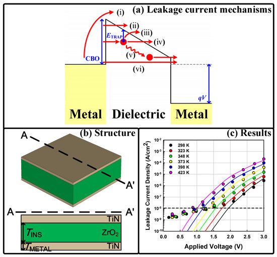 (a) Energy band diagram of a metal/insulator/metal (MIM) capacitor, including the possible charge transport mechanisms. CBO: conduction band offset between the metal and dielectric layers. ETRAP is an energy level of a trap state. The red arrows show possible charge transport mechanisms: (i) thermionic emission, (ii) Fowler–Nordheim tunneling, (iii) Poole–Frenkel emission (PFE), (iv) trap-assisted tunneling (TAT), (v) trap-to-trap tunneling, and (vi) direct tunneling. The red circles represent trapped electrons at the trap sites. q and V are the elementary charge and applied voltage, respectively. (b) Bird’s-eye and cross-sectional views of a simulated TiN/ZrO2/TiN capacitor. (c) Calibrated simulation data compared with experimental data [21]. It is worth noting that the leakage current at a low bias is ignored, as only the shallow trap level, which originates from oxygen vacancies, is considered [20].