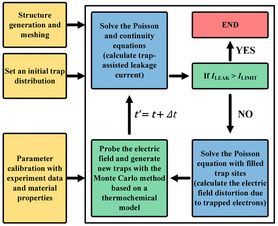 The TDDB simulation was performed based on the leakage current simulation. Figure 2 shows a flowchart of the proposed TDDB model. The TDDB simulation followed these five steps: (i) set the initial trap distribution, structure, material parameters, and leakage current at the TDDB condition (ILIMIT); (ii) after the calculation of the leakage current (ILEAK) through the trap-assisted charge transport models, determine whether the TDDB condition is satisfied (ILEAK > ILIMIT); (iii) if not, fill the trap sites with electrons and calculate the electric field using the Poisson equation, which is distorted by the trapped electrons; (iv) probe the electric fields of all nodes and calculate the new trap generation probability based on the thermochemical model [8]; and (v) repeat the above procedure after the update of the trap distribution using the Monte Carlo method.