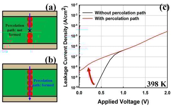 Calculation of ILIMIT assuming the percolation path is (a) not formed or (b) formed; (c) corresponding leakage current densities. The red circles represent traps, while the blue lines represent leakage current paths by trap-to-trap tunneling.