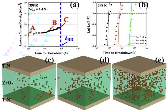 where ∆H0 is the enthalpy of activation for bond breakage, kB is the Boltzmann’s constant, T is the temperature, γ is the field acceleration parameter, and E is the applied electric field. The main parameters were ∆H0 = 1.874 eV and γ = 8.67 cm/MV [21]. The newly generated trap was affected by the existing trap. This phenomenon occurred as the existing trap became an electron trap site. The trapped electron reduced the defect formation energy nearby, thus increasing the probability that a new trap would form around the existing trap [22]. The enhancement in the local electric field by the trapped electrons led to an increase in trap generation probability around an existing trap. Figure 4a shows the progression of the trap generation and occupation of TDDB according to the stress. In this case, the stress bias was 4.4 V for the voltage of the top electrode (VTOP), while the temperature was 398 K. Figure 4c–e show the trap distribution at each point in Figure 4a. Traps were generated through probabilities based on the TDDB model and eventually reached the TDDB condition by forming a percolation path. Furthermore, TDDB simulations were repeated in many samples, changing the stress bias conditions. The TDDB distribution was summarized as a Weibull plot, which was calculated as a cumulative probability density function (CDF), as shown in Figure 4b. Particularly, when ln(–ln(1 − CDF)) = 0, which represents the lifetime, the experimental [21] and simulation results were consistent.