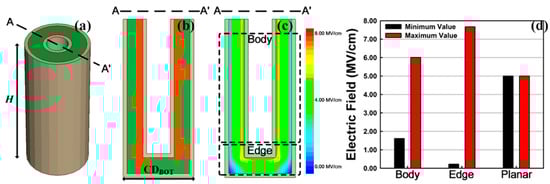 (a) Bird’s-eye view of the cylindrical structure. (b) Trap formation at the TDDB. The red region indicates generated traps. (c) Electric field contour (VTOP = 1.0 V, without traps). (d) Summarized maximum and minimum electric fields in the body, edge, and planar (VTOP = 1.0 V, without traps) cases.