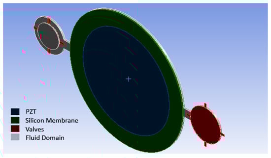 The model for the solid parts is depicted in Figure 4. The actuation diaphragm is represented by a suspended disc, with a laminate cross section. The actuation is achieved by means of a piezoelectric layer deposited on a silicon plate. Among the various possibilities, lead zirconate titanate (PZT) is chosen as the active material, in the form of a thin film []. This is fully compatible with the MEMS production process, through the adoption of one of the available techniques, e.g., sputtering [], pulsed laser deposition [], and sol-gel process []. The piezoelectric layer has a circular shape, coaxial with the silicon disc. The radius of PZT, see Table 3, is selected according to the results presented in a previous study [], which showed that the highest stroke volume was obtained when the ratio between the radius of the active layer and the radius of the silicon diaphragm was equal to 0.73. The passive valves consist of silicon discs, that are attached to the rigid frame by means of four rectangular beams. The elastic deformation of the beams allows for the vertical movement of the disc that alternatively opens and closes the inlet hole (the same applies to the outlet). The sealing of the valves in the closed rest configuration is ensured by a prestress in the elastic ligaments, given by an imposed transverse displacement on the edge of the disc.
