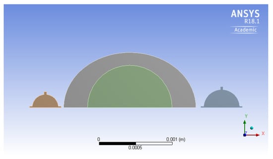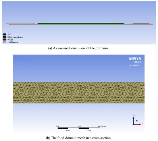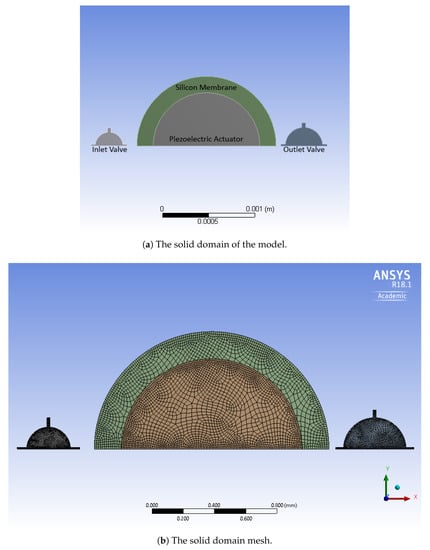 For the proposed micropump, a two-way fluid–Structure Interaction (FSI) is modeled with the commercial code ANSYS® 18.1 and 19.2, with the mechanical and CFX solvers. At each staggered loop, the mechanical solver sends the time derivative of the displacement of the interface nodes to the target nodes in the fluid domain. On the other hand, the CFX solver sends back the stress to the solid nodes based on the traction equilibrium at the interface [].