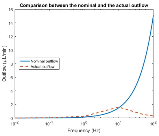 The proposed micropump is investigated for different values of the input voltage frequency. The most important figure of merit is the outflow of the micropump that is reported in Figure 5 with the actuation voltage equal to 60 V for the range of frequency between 0.01 to 100 Hz. Ideally, the displaced quantity of fluid can be estimated on the basis of the so-called stroke volume , i.e., the variation in the volume of the pumping chamber due to the movement of the actuating diaphragm during one cycle. For a given pumping frequency , the nominal outflow would be
