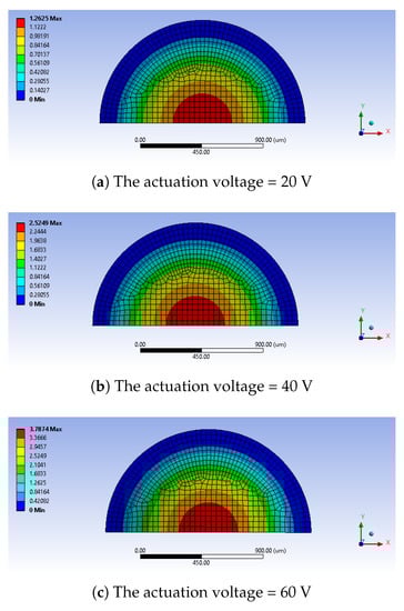 At the first stage of the micropump working cycle, the silicon membrane is deformed in the upward direction due to the PZT deformation. The pressure gradient causes an inlet valve opening and the fluid enters in the chamber. The computed maximum deflection of the diaphragm for different actuation voltages is demonstrated in Figure 6.
