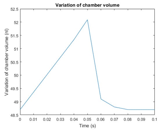 Figure 8 presents the variation of the chamber volume during a complete pumping cycle. After the silicon membrane reaches the maximum stroke, as mentioned above, the piezoelectric input is instantaneously dropped and the diaphragm tends to recover its initial configuration. Due to the membrane displacement, the fluid pressure increases, and as a consequence, the outlet valve is pushed in its recess and the hole is opened. At the same time, the elastic recovery enables the closing of the inlet channel. The results of Figure 8 allow one to compute the quantity of fluid that is pushed out from the chamber in a cycle connected to the above defined stroke volume.