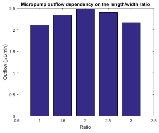 The same analysis has been done on similar geometries with different length/width ratios of the ellipse. As noticed in Figure 13, the numerical outcomes indicate a non-monotonic behavior. For aspect ratios close to unity, the outflow steadily increases in view of the optimized flux and of the larger deflection of the diaphragm. Nevertheless, there is a negative effect of the larger volume of fluid to be displaced. As a consequence, after a certain value, the actuator does not provide sufficient power to promote the fluid motion and the outflow decreases. The optimal outflow is achieved for an aspect ratio equal to 2 (namely, length: 3000 , width: 1500 ); in that case, the outflow attains a value of 2.5 μL .