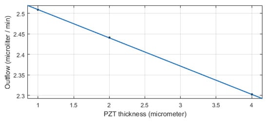 In the manufacturing process of this two-wafer micropump, wafer bonding is one important step. There are several methods for silicon wafer bonding such as anodic bonding [], metal bonding [], and glass frit bonding []. The residual stresses and possible residual warping coming from the bonding process and due to the coefficients of thermal expansion mismatch can have an influence on the mechanical properties of the micropump components and must be carefully controlled. Another important parameter in the fabrication process which affects the performance of the micropump is the piezoelectric layer thickness. The simulations have shown that, by increasing the piezoelectric layer thickness, the outflow decreases linearly (see Figure 14).