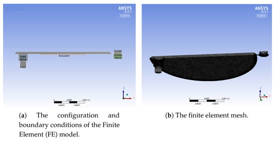 For the boundary conditions on the fluid domain, both the inlet and outlet have a zero relative pressure with respect to the outside of the domain. The faces attached to the silicon membrane and valves are set to the fluid–structure interaction sites as well. The other faces of the fluid domain are set to stationary walls, i.e., the velocity of the fluid is equal to zero.
