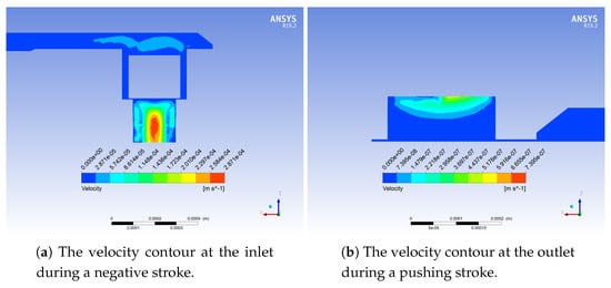 Computed velocity contours at the inlet and outlet of the micropump [].