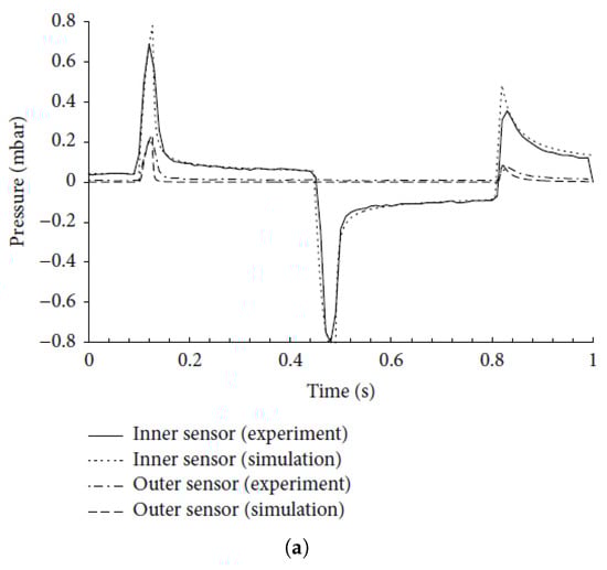 To validate the model, the pressure profiles measured inside and outside the chamber in the Debiotech micropump is compared with the results of the numerical model and shown in Figure 19. In addition, the pressure profile obtained at a 10 Hz frequency of the new device proposed in this paper is shown in Figure 19c in the same time window. The numerical model built in the present work for the simulation of the Debiotech micropump has been obtained with the same approach used for the simulation of the new two-wafers piezoelectric micropump proposed in this paper. As shown from Figure 19, the model shows a good agreement with the experimental and numerical results reported in Reference []. Note that the pressure peak for the newly designed micropump is 1.5 mbar, which is almost twice that of the Debiotech device.