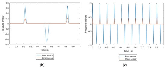 A comparison of the pressure profiles for the micropump []: The results for the (a) experimental, (b) numerical, and (c) new device proposed in the present paper. (a) The experimental results of the inner pressure sensor. From [] (Reproduced under Creative Commons Attribution License; (b) The pressure profile obtained from the simulation; (c) The pressure profile obtained for the proposed device.