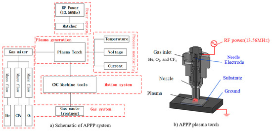 A schematic diagram of the APPP setup is shown in Figure 1 [19]. The setup included a plasma generation torch (capacitively coupled), a gas supply module, and a multi-axis computer numerical control machine tool. A 13.56 MHz radio frequency (RF) power was applied to the central aluminum needle as a positive electrode and the workbench was grounded. Thus, the substrate (fused silica) placed on the workbench served as a dielectric barrier layer. In addition, a ceramic nozzle coaxial with the needle electrode was used to restrain the gas flow. The inner mixed gas, including He, O2, and CF4, was excited in the RF electromagnetic field. The flow rates of gases were controlled by the multichannel mass flow controller.