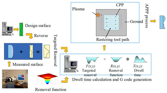 The APPP structuring process flow chart is illustrated in Figure 5. First, to obtain the targeted removal map, the design CPP surface height data was inverted and superimposed with the initial substrate surface (measured by interferometer). Then, according to the removal map and selected removal functions, the dwell time was calculated (as a deconvolution optimization process), and the corresponding numerical control code was generated for the machine tool. Finally, the APPP process was performed to structure the phase topography on the optic substrate.