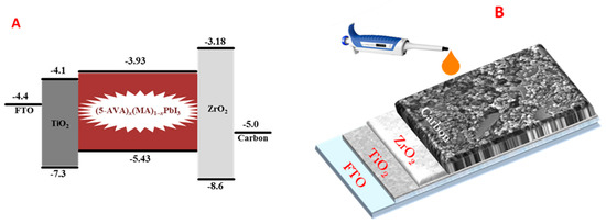 Carbonaceous materials provide a successful alternative for the construction of hole-transporter-free PSC variants [11,12,13,14,15]. A preferred configuration, which we have also adopted for the present work is described by the following scheme: FTO/bl-TiO2/m-TiO2/buffer layer/Carbon. Buffer and carbon layers consist of mesoporous materials through which the liquid perovskite precursors are infiltrated. Perovskite is then formed and disperses throughout the three mesoporous layers of titania, buffer, and carbon. As buffer, most researchers use zirconia, while carbon collects holes and at the same time plays the role of cell counter electrode. The carbon layer is composed of a mixture of graphite with carbon black (i.e., commercial carbon nanoparticles). This mixture is electrically conductive and energetically favorably located to scan holes in the perovskite valence band [16,17] (cf. Figure 1). Of course, other carbon layer compositions, including popular carbonaceous variants, such as carbon nanotubes or graphene, may be employed, but simple graphite-carbon black pastes [18,19] can offer excellent carbon electrodes. In the present work, we opted for the same PSC configuration, as summarized and pictorially represented by Figure 1.