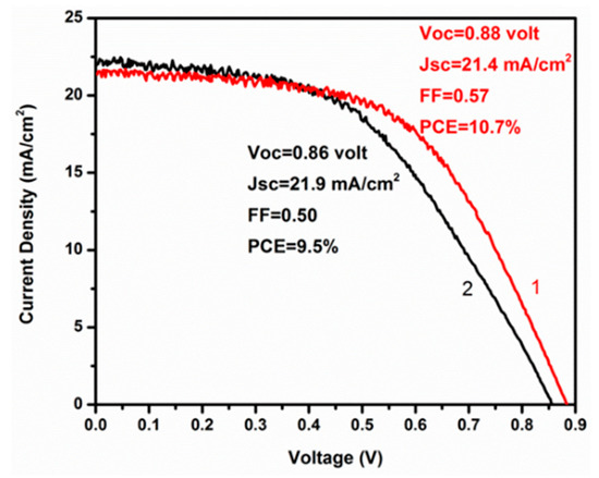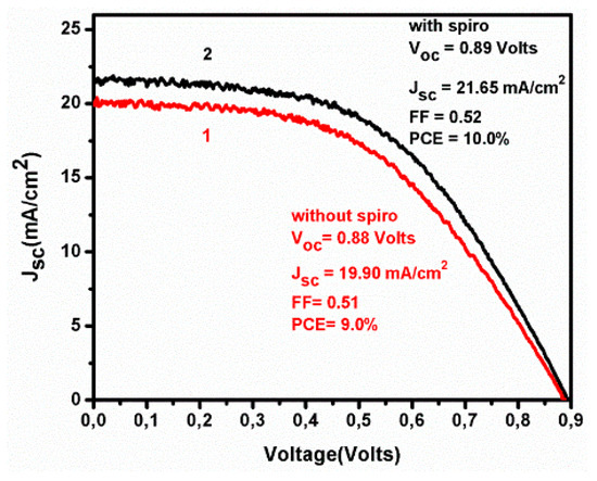 J-V plots for devices made without (1) and with spiro-OMeTAD (2).