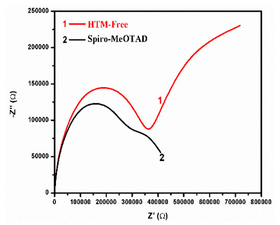 Nyquist plots for data obtained in the dark and by zero bias for devices constructed without (1) and with (2) spiro-OMeTAD.