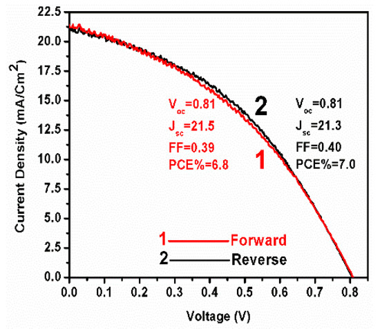 The data of Figure 2 show that a device with a descent efficiency of PCE = 10.7% can be fabricated under ambient conditions by a simple procedure using fully printable (screen printed) components. The efficiencies reported by other researchers using similar carbon based PSC devices vary in a range that includes this value [13,20,21,22,23,24]. As already said, we have presently tested the possibility to increase device efficiency simply by adding an organic hole transporter. Plain spiro-OMeTAD was chosen for this purpose without any additives. spiro-OMeTAD was introduced by using its solution of 36 mg/mL in chlorobenzene, which was spread on the top of the carbon layer (after the introduction of the perovskite and the initial cell characterization) and then it was spun at 3000 rpm for 1 min and annealed at 60 °C for 5 min. As seen in Figure 3, the presence of this agent did increase device performance. All photovoltaic parameters, Jsc, Voc, and fill factor (FF) increased albeit to a small extent.