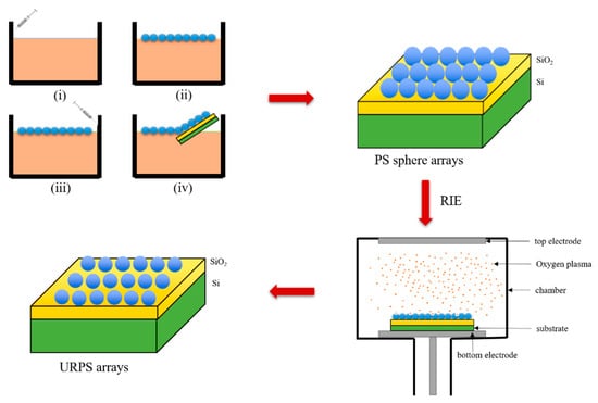 The procedure of the self-assembly monolayer of polystyrene (PS) sphere arrays and the uniformly rough polystyrene sphere (URPS) arrays. RIE: reactive ion etching.