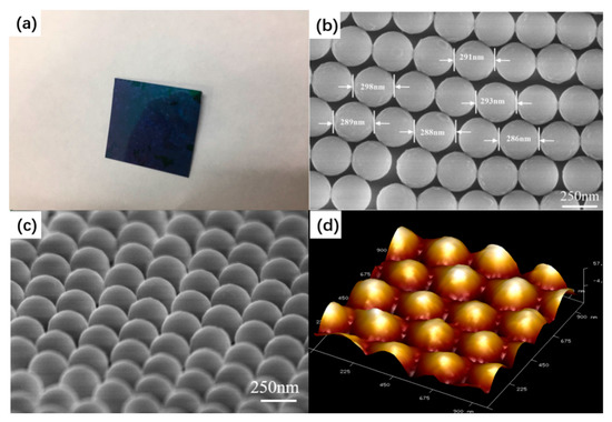 (a) Photograph of PS sphere arrays; (b) top-view SEM image of PS sphere arrays; (c) side-view SEM image of PS sphere arrays; and (d) three-dimensional (3D) atomic force microscope (AFM) image of PS sphere arrays.