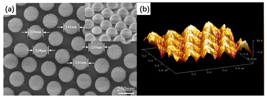 The PS sphere arrays were fabricated by the self-assembly technique at the air/water interface. The main steps of the process are shown in Figure 1 and include (i) filling the beaker with deionized water and adding the PS sphere suspensions mixed with 66% ethanol to the air/water interface along the beaker wall; (ii) ultrasonic concussion using 40 W power to assist the self-assembly of PS spheres; (iii) adding the proper amount of surfactant (SDS) to the water along the other side of beaker wall; and (iv) transferring the self-assembly monolayer of PS spheres onto the substrate. The URPS arrays were formed by reactive ion etching (RIE) with oxygen (O2) gas. The gas flow rate was 10 sccm, the radio frequency (RF) was 13.56 MHz, and the power (bottom electrode) was 40 W. Finally, a 20 nm Au film was coated by sputter deposition onto PS sphere and URPS arrays. Au has a high surface energy and adsorptive force with molecules to adsorb more molecules, so Au was used as a deposit on the surface of PS sphere and URPS arrays [30]. A scanning electron microscope (SEM, S-5500, HITACHI, Tokyo, Japan) was used to determine the characteristics of the surface of the SERS substrates and an atomic force microscope (AFM, multimode 8, Bruker, Billerica, MA, USA) was used to analyze the morphology of the SERS substrates.