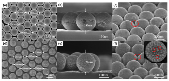 The NERS substrates were processed by sputter deposition onto PS sphere arrays and URPS arrays. As shown in Figure 5a and Figure 5d, the deposition of the Au film did not disorder the structure of the PS sphere and URPS arrays. Au nanoparticles and clusters were formed on the AuURPS arrays due to RIE. However, no Au nanoparticles and clusters were formed on the surface of AuPS sphere arrays, because the surface of the PS sphere arrays was smooth. The Au nanoparticles can confine the electromagnetic hot spots in the inter-structure gaps, and this can enhance the Raman signal [35,36,37]. The Au films sputtered on the surfaces of the PS sphere arrays and URPS arrays, as shown in the side-view SEM images of Figure 5b and Figure 5e. From these observations, strong local electric fields are expected to appear at the interstitial regions and Au nanoparticles and clusters (the red region in Figure 5c and Figure 5f), which is favorable for the enhancement of the Raman signal [22].