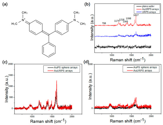 (a) The chemical structure of MG; (b) Raman signals of MG molecule (5 μg/mL) from planar Si, URPS arrays, and AuURPS arrays; Raman signal of MG molecule (c) 5 μg/mL; and (d) 500 ng/mL from AuPS sphere arrays and AuURPS arrays.