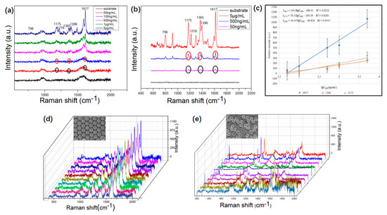 (a) Raman spectra of MG molecules from 50 ng/mL to 5 μg/mL under the 532 nm wavelength; (b) Raman spectra of MG molecules from 50 ng/mL to 5 μg/mL under the 633 nm wavelength of the same sample; (c) the relative intensities and linear fitting line for the Raman band at 1175, 1365, and 1617 cm−1 as a function of MG logarithmic concentration; (d) ten Raman spectra of MG molecules on the NERS substrate of ordered AuURPS arrays, and the inset shows the side-view SEM images of the ordered AuURPS arrays; and (e) ten Raman spectra of MG molecules on the SERS substrate of disordered AuURPS arrays, and the inset shows the side-view SEM images of the disordered AuURPS arrays.
