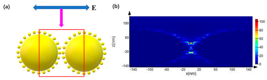 (a) The simulated model with Au nanoparticles and clusters; (b) Electric field distribution of Au nanoparticles and clusters at the excitation wavelength of 532 nm.