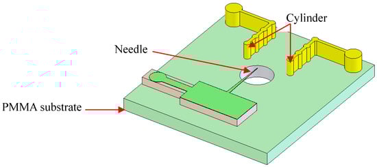 In a previous study, we showed that corona and glow discharge can be realized in an ambient atmosphere using the needle-to-cylinder electrode [22]. The COMSOL simulation results showed that the single central needle-to-double cylinder is the best structure of the four types of electrodes (single needle-to-single cylinder; single bottom needle-to-double cylinders; single central needle-to-double cylinders; and double needles-to-double cylinders) to achieve a stable and higher ion current under the same conditions. Therefore, the micro ion source design was designed and fabricated as a single needle-to-double cylinder configuration, shown in Figure 1. The needle and two-cylinder electrodes were formed on the PMMA substrate. There was a hole with a diameter of 0.75 mm for injecting the sample into the bottom substrate. When a high voltage was applied to the needle, the sample can be ionized by the air discharge process.