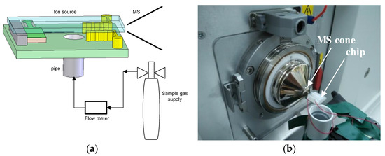 To obtain the ion characteristics of the sample, the chip was interfaced to the LTQ XL™ mass spectrometer (Thermo Scientific Corp., Waltham, MA, USA) The mass spectrometer worked in the positive ion mode and the range of charge to mass was chosen as 24 to 200. The work temperature was set as 30 °C and the voltage of the skimmer cone was 0 V. The mass spectrometer experimental setup is shown in Figure 4. To obtain the ion signal, the discharge voltage of the needle-to-cylinder electrode was −2500 V. The flow velocity of the sample gas was controlled by a flow meter (D08-1F provided by Beijing QixingHuachuang Electronics Co. Ltd., Beijing, China). With a pipe of 3 mm in diameter, the sample gas was injected into the ion source chip and ionized. An O-ring (Viton) was used to make a seal between the chip and the MS cone. Finally, the ions entered the MS cone and were detected according to their mass-to-charge ratios. The experimental setup was termed chip-MS.