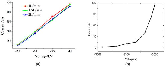 The volt-ampere characteristic is shown in the Figure 6. Figure 6a shows the discharge characteristic of the ion source when the gas flow velocity is varied. Figure 6b concerns the discharge characteristic of the ion source without gas flow (see [23]). There are interesting findings when comparing our results with those found in [23]. The discharge current is almost the same under different N2 supply speeds, as shown in Figure 6a. This demonstrated that the gas jet does not have an obvious effect on the discharge current. In contrast to Figure 6b of [23], it shows different characteristics. In Figure 6b, there are corona and glow discharges, apparently, when there is no gas flow. In the stage of glow discharge, the current increases sharply [25]. But in Figure 6a, the experimental situation is different. The N2 is used as the carrier gas and there is gas flow in the discharge region. The volt-ampere characteristic is different from that in Figure 6b in [23]. Firstly, the corona discharge stage is difficult to be obtained with the gas flow. It converted directly into the glow discharge. A possible reason may be that, with the gas flow, the draft velocity of the negative ions increases. Accordingly, electron detachment from the negative ions also happens frequently. Additionally, the shielding effect of the negative ions has receded and finally disappeared. On the other hand, as the discharge gap between the needle and the cylinder is very short, the discharge emission can fill up the discharge gap easily. At this time, the discharge current becomes the DC current, which is completely derived from the electronic current [26,27]. Furthermore, the Trichel pulse (corona discharge) is hard to get. Secondly, the discharge current is almost the same under different N2 flow velocity. As the gas flow velocities are 1 L/min, 1.5 L/min and 2 L/min, the difference among these flow velocities are not obvious. Then the effect of the gas flow velocity on the electro detachment from the negative ions can be ignored. So, the discharge current is almost the same. For connecting with FAIMS, the discharge state of the ion source is almost the same with different gas flow velocities.