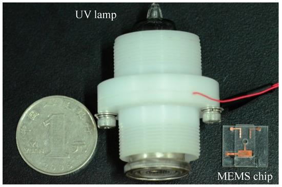 On the other hand, the advantage of the MEMS technology is that it can fabricate in mass production. The MEMS chip was fabricated at the Institute of High Energy Physics, Chinese Academy of Science. A total of 50 MEMS chips were fabricated together. The unit price for a MEMS chip is about tens of dollars. The UV lamp (PKS106) used in the experiment was purchased from Heraeus Company, and the unit price is about hundreds of dollars. For a unit, a MEMS chip is much cheaper than the UV lamp.