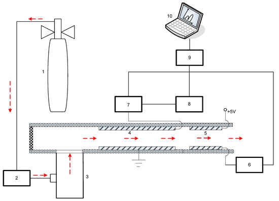 Figure 9. Schematic diagram of the high-field asymmetric ion mobility spectrometry (FAIMS) setup. 1. Sample gas; 2. Flow meter; 3. Microelectromechanical systems (MEMS) chip; 4. Drift region; 5. Detector; 6. Electrometer; 7. The high-filed rectangular asymmetric waveform; 8. The compensation voltage; 9. Controller; and 10. Computer.