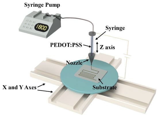 The schematic diagram of the near-field electrohydrodynamic direct-writing (NFEDW) method. PEDOT:PSS—poly(3,4-ethylenedioxythiophene):poly(styrenesulfonate).