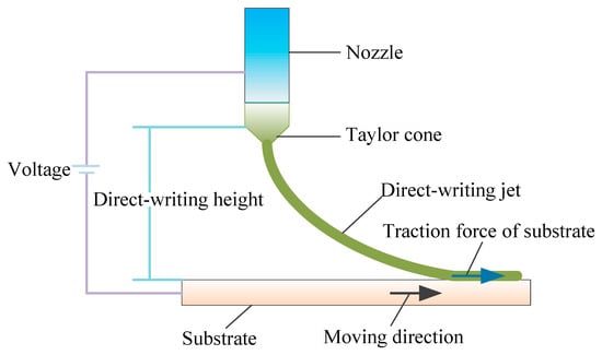 The NFEDW method is used to write the viscous polymer solution directly, and the direct-writing jet model, which is subjected to the pressure, the electrostatic force, the traction force of the substrate, the surface tension, the gravity, etc., is shown in Figure 2. According to the Navier–Stokes equation, the fluid motion equation can be expressed as follows