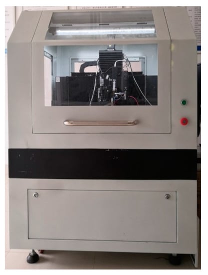 The experimental setup consisted of a motion platform, an injection system, and a high-voltage power supplier (DW-P303-2ACF1, Dongwen Inc., Tianjin, China). The motion platform consisted of the X-axis, Y-axis, and Z-axis. The X-axis and Y-axis were composed of the AC servo linear motor (HIWIN, Taichung, Taiwan), linear guide rail (HIWIN), and linear grating ruler (Renishaw, London, UK), respectively, and the Z-axis was composed of the AC servo motor (Panasonic, Tokyo, Japan), ball screw (HIWIN), linear guide rail (HIWIN), and linear grating ruler (Renishaw). The injection system consisted of a syringe pump (TJ-1A- Micro Flow Rate, Longer Precision Pump Co., Ltd., Baoding, China), syringe, and nozzle. The nozzle was a stainless-steel nozzle, which was used to generate the direct-writing jet, with an inner diameter of 200 µm and an outer diameter of 410 µm. The self-developed experimental setup of the NFEDW method is shown in Figure 3.