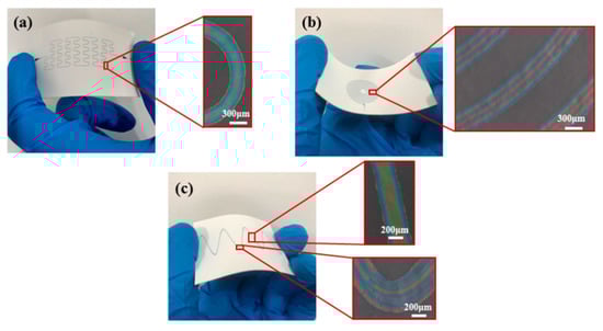 Fabricating organic micro patterns of various shapes on the flexible insulating substrate. (a) The organic micro pattern of the second-order self-similar structure curve. (b) The organic micro pattern of the helical curve. (c) The organic micro pattern of the wave curve.