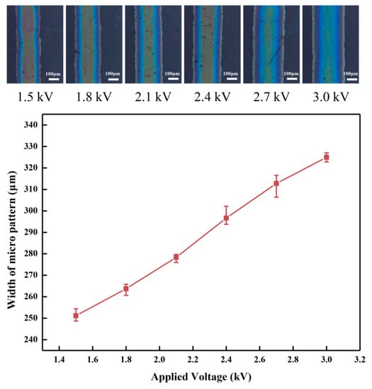 The applied voltage of the high-voltage power supplier is a key process parameter of the direct-writing micro pattern for the NFEDW method, and ions in the PEDOT:PSS mixed solution generate a downward electric field force under the action of the applied voltage. The fabricated organic micro patterns were observed on the inverted metallographic microscope (DMI3000M, Leica). The average width of the organic micro pattern increased from 251.2 to 325.0 µm with the increase of the applied voltage from 1.5 to 3.0 kV under the conditions of a direct-writing height of 0.35 mm, moving velocity of 10 mm/s for the motion platform, and flow rate of 80 nL/min in the injection system, which are shown in Figure 5. When higher voltage is applied by the high-voltage power supplier, higher axial and radical electric fields are generated, and the organic conductive solution of the mixed PEDOT:PSS materials is subjected to greater electric field force in the NFEWD process. Under the action of larger electric field force, more solution is ejected from the nozzle. When the motion platform has the same velocity and distance, more solutions are pulled out from the nozzle and deposited on the flexible insulating substrate, which leads to the increase of the width of the organic micro pattern. On the other hand, with the increase of the applied voltage, the electric field intensity increases, and this leads to more charges accumulated on the surface of the Taylor cone. The charge density of the direct-writing jet also changes the motion of the jet and the shape of the micro pattern, thus further increasing the width of the organic micro pattern.