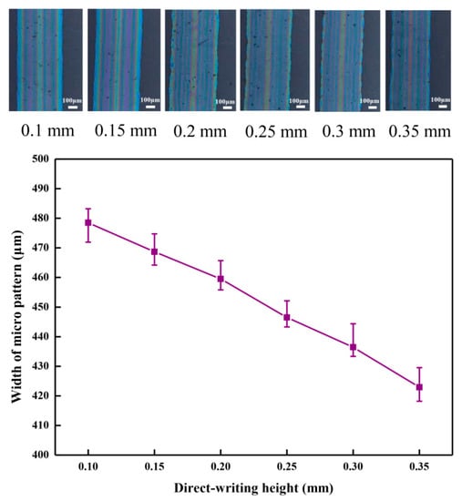 The direct-writing height affects the width of the fabricated organic micro pattern when using the NFEDW method. The organic micro patterns were observed on the inverted metallographic microscope (DMI3000M, Leica). The average width of the organic micro pattern decreased from 478.5 to 422.9 µm with the increase of the direct-writing height from 0.1 to 0.35 mm under the conditions of an applied voltage of 2.0 kV, moving velocity of 5 mm/s for the motion platform, and flow rate of 166 nL/min in the injection system, which are shown in Figure 6. The change of the direct-writing height promoted the change of the electric field force on the direct-writing solution of the PEDOT:PSS mixed materials. When the applied voltage was constant, the electric field force on the PEDOT:PSS mixed solution decreased with the increase of the direct-writing height. Therefore, the width of the organic micro pattern decreased with the increase of the direct-writing height.