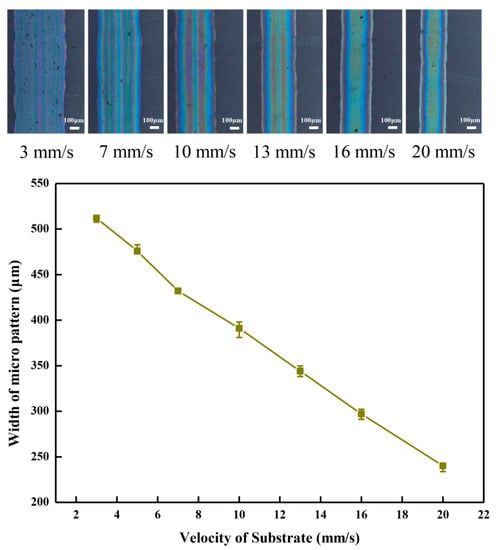 The moving velocity of the flexible substrate is also an important parameter affecting the width of the organic micro pattern. The organic micro patterns were observed on the inverted metallographic microscope (DMI3000M, Leica). The average width of the organic micro pattern decreased from 512.9 to 297.3 µm with the increase of the moving velocity of the flexible substrate from 3 to 20 mm/s under the conditions of an applied voltage of 2.0 kV, direct-writing height of 0.4 mm, and flow rate of 166 nL/min in the injection system, which are shown in Figure 7. On the one hand, under the same volume of the direct-writing solution, with the increase of the moving velocity of the flexible substrate, the distance of the deposited micro pattern increases, so the width of the organic micro pattern deposited on the flexible substrate decreases. On the other hand, because the PEDOT:PSS mixed solution has certain viscous and surface tension, the moving substrate exerts a tractive force on the direct-writing solution during the movement of the flexible substrate. With the increase of the moving velocity of the flexible substrate, the tractive force increases, and this reduces the width of the organic micro pattern. In addition, increasing the moving velocity of the flexible substrate is helpful to prevent the direct-writing solution from expanding around, which can effectively improve the deposition quality of the organic micro pattern.