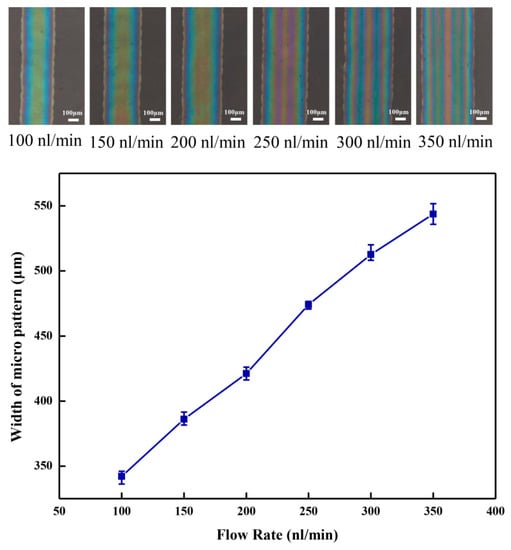 The flow rate of the injection system also affects the width of the organic micro pattern in the NFEDW process. The organic micro patterns were observed on an inverted metallographic microscope (DMI3000M, Leica). The average width of the organic micro pattern decreased from 543.7 to 342.1 µm as the flow rate of the injection system decreased from 350 to 100 nL/min under the conditions of an applied voltage of 2.0 kV, direct-writing height of 0.15 mm, and moving velocity of 10 mm/s for the motion platform, which are shown in Figure 8. When the diameter of the nozzle remained unchanged, the change of the flow rate of syringe pump led to the change of the pressure of the injection system. When the flow rate of the injection system decreased, the volume of the PEDOT:PSS mixed solution pulled out from the nozzle decreased under the action of the electric field. Therefore, as the flow rate of the injection system decreased, the diameter of the direct-writing jet decreased, and less volume of the PEDOT:PSS mixed solution was deposited on the flexible insulating substrate in the direct-writing process, which reduced the width of the deposited organic micro pattern. In addition, the direct-writing jet with a smaller radius has larger specific surface area, which accelerates the evaporation of solvent. The experimental results show that the effect of the flow rate of the injection system on the width of the deposited organic micro pattern was more obvious than that of the applied voltage, direct-writing height, and moving velocity of the flexible substrate. Therefore, the direct-writing resolution of the fabricated organic micro pattern can be effectively improved by reducing the flow rate of the injection system or the inner diameter of the nozzle in the NFEDW method.