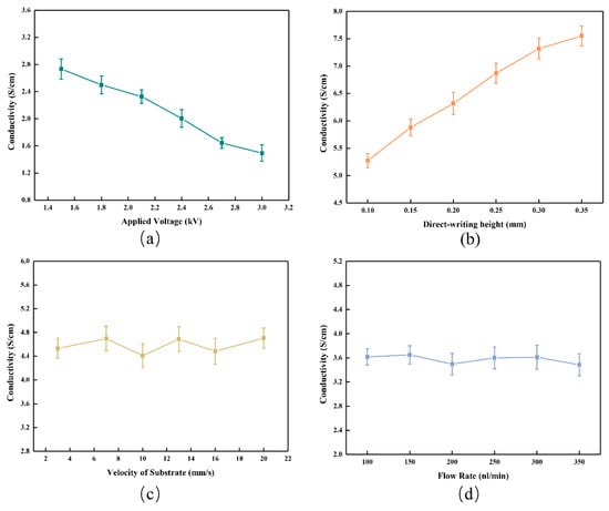 The electrical conductivity of the untreated PEDOT:PSS is 0.2–1 S/cm []. The fabricated organic microcircuit patterns of the natural drying in air at room temperature were tested by a thin film thermoelectric tester (JouleYacht, TRT-100, Wuhan Joule Yacht Science and Technology Co., Ltd., Wuhan, China) at a detection temperature. With the increase of the applied voltage from 1.5 to 30 kV, the conductivity of the fabricated organic micro pattern decreased from 2.7 to 1.49 S/cm, which is shown in Figure 9a. With the increase of the direct-writing height from 0.1 to 0.35 mm, the conductivity increased from 5.28 to 7.76 S/cm, which is shown in Figure 9b. The conductivity of the organic micro pattern remained basically unchanged with the increase of the moving velocity for the substrate and the flow rate for the injection system under the condition where the three other process parameters remained constant, respectively, which are shown in Figure 9c,d. Therefore, the applied voltage and the direct-writing height have an effect on the conductivity. With the increase of the applied voltage, the electric field force increased, and this led to the increase of the organic micro-pattern width (Figure 5). Under the condition where the three other process parameters remained constant, the conductivity decreased with the increase of the organic pattern width. With the increase of the direct-writing height, the electric field force decreased, and this led to the decrease of the organic micro-pattern width (Figure 6). The decrease of the fabricated pattern width led to the increase of its conductivity under the conditions where the three other process parameters remained constant.