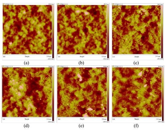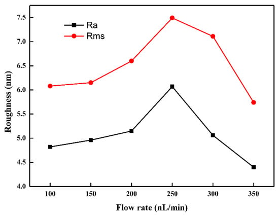 The atomic force microscopy (AFM) images of the deposited micro patterns are shown in Figure 10. When the flow rate of the injection system increased from 100 to 350 nL/min under the conditions of an applied voltage of 2.0 kV, direct-writing height of 0.15 mm, and moving velocity of 10 mm/s for the motion platform, surface microstructures developed, as shown in Figure 10. The roughness of the deposited micro patterns is shown in Figure 11. By analyzing Figure 10, it can be determined that the internal structure and morphology of the micro patterns are very similar. When the other three parameters remained unchanged, the effect of the flow rate variation on the micro pattern was very small. By analyzing Figure 11, it can be determined that the roughness of the organic micro patterns changed very little with the increase of the flow rate of the injection system under the condition where the three other process parameters remained constant.