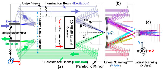 Ray-tracing simulation of the optical design for the MEMS-based intraoperative near-infrared (NIR) confocal microscope’s scan-head (outer diameter (OD): 5.5-mm package). (a) Schematic drawing of the scan-head, such as the collimating, focusing, and scanning in the post-objective dual-axis confocal architecture aimed for 3D NIR fluorescence imaging, demonstrating the geometric requirements for the MEMS scanner; a pair of tiny Risley prisms were used for precise alignment; single-mode fibers (S630HP, numerical aperture (NA) = 0.12) were used for delivering and collecting light beams; SIL: solid immersion lens, β: free-space numerical aperture of the individual beams, and α: the intersection half-angle of the beams. (b) Lateral scanning around the Y-axis of the micro-mirror. (c) Lateral scanning around the X-axis of the micro-mirror.