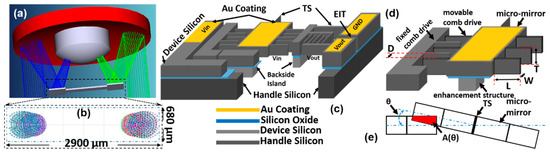 For clinical applications, miniaturized intraoperative NIR confocal microscopies usually require high sensitivities for the emitted weak fluorescence signals, a large FOV with a low driving voltage (safety voltage 36 V), and compact form factors. Therefore, a parametrically-resonant 2D MEMS scanner with a patterned Au-coated surface (>90% reflectivity for an NIR > 785-nm wavelength) will be an ideal choice for the scan engine inside the confocal microscopes. In this project, the proposed gimbal frame-based 2D MEMS scanner was an advanced design based on our previous 1D parametrically-resonant scanner design [34,35] for miniaturized confocal microscopes [29]. As shown in Figure 2a,b, the geometric requirements for the 2D MEMS scanner have been determined in the ray-tracing simulation and the CAD drawing of the distal end of the fiber-based confocal microscope’s scan-head (OD 5.5 mm). The actual beam width (1/e2) on the micro-mirror changed (Figure 2b) due to the axial scanning along the Z-axis from 0–400 µm. An effective “dumbbell shaped” reflective area of 680 by 2900 µm2 (Figure 2b) will be sufficient for steering the excitation and emission beams. The 2D MEMS scanner will be micro-machined using a single SOI wafer (40 µm device silicon/2 µm buried oxide/500 µm handle silicon). It used an in-plane comb-drive actuator configuration, as shown in Figure 2c–e, based on the parametric resonance working principle.