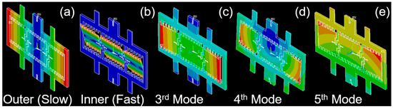 Finite element analysis (FEA) simulation and modal analysis in ANSYS for the 2D parametrically-resonant MEMS scanner. (a) Outer (slow) tilting around the Y-axis (resonant frequency: ~1090 Hz); (b) inner (fast) tilting around the X-axis (resonant frequency: ~6250 Hz); (c–e) higher order resonant modes are designed to be far away from the basic tilting modes around the X- and Y-axes, 3rd~5th mode: ~11,230 Hz, ~13,830 Hz, ~13,870 Hz, respectively.