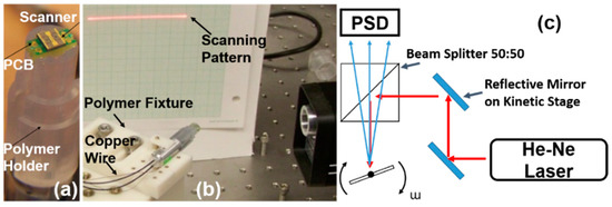 Characterization of the 2D Au-coated resonant MEMS scanner using a position sensing detector (PSD)-based measurement system setup. (a) Simple packaging of the MEMS device onto the PCB stage mounted on a 3D-printed polymer holder; (b) scanning pattern demonstration by clamping the holder on the 3D-printed polymer fixture; thin protected copper wires were used for delivering electricity to the MEMS scanner; (c) schematic drawing of the custom-made measurement system setup for fully characterizing the 2D resonant MEMS scanner; the PSD was located behind the 50:50 beam splitter; two silver-coated reflective mirrors held on kinetic stages were used to align the He-Ne laser beam accurately onto the surface of the scanning micro-mirror; the steered laser beam passed through the beam splitter and was detected by the PSD with fast responses.