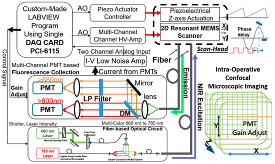 A single DAQ card (PCI-6115, deep onboard memory = 32 MS) has been utilized for the NIR fluorescence intraoperative confocal microscopic imaging system. A custom-made NI-DAQmx-based LabVIEW (National Instrument) program has been developed for controlling the 2D resonant MEMS scanner and the piezoelectrical actuator (P-601.4SL) with feedback controls, acquiring fluorescence signals, and reconstructing 2D images.